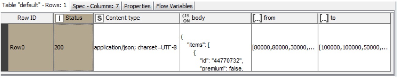 Решим задачу кластеризации данных по вакансии «Программист» в населенном пункте «Саранск» по состоянию на 23 мая 2021 года, которая покажет разбиение данных по величине предлагаемой заработной платы. Для этого создадим рабочий процесс (Workflow), считаем данные, воспользовавшись соответствующим узлом (Node) GET Request (Tools & Services→REST Web Services→GET Request), перенесем его из репозитория узлов на рабочее пространство. В конфигурации данного узла размещаем следующий код на языке python, осуществляющий запрос.