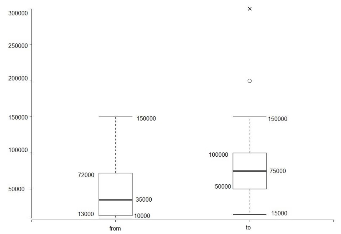 Данные в таком виде использовать для кластеризации нельзя. Необходимо выполнить элементы так называемого разведочного анализа данных, а именно осуществить разгруппировку данных по столбцам, фильтрацию этих столбцов, вычисление основных статистик, заполнение пропущенных значений в полях с размером заработной платы (например, медианным значением), так как не все работодатели указали на сайте значения полей «from» и «to» и, наконец, их нормализацию. Для этого были использованы узлы Ungroup (Manipulation→Row→Transform→Ungroup), Column Filter (Manipulation→Colum→ Filter→ Column Filter) и Missing Value (Manipulation→Colum→ Transform→ Missing Value). Узел Box Plot (Views→JavaScript→Box Plot) позволяет построить «ящичковые диаграммы» данных полей «from» и «to». На диаграммах отображаются статистические параметры: минимум, нижний квартиль, медиана, верхний квартиль (соответственно, 25-й, 75-й 50-й процентили) и максимум. Эти параметры называются надежными, поскольку они нечувствительны к экстремальным выбросам. На рисунке 3 представлены данные до нормализации и заполнения пропущенных значений, из которого видно, что данные параметра «to» имеют несколько «выбросов» (точка) и экстремальное значение (крест).