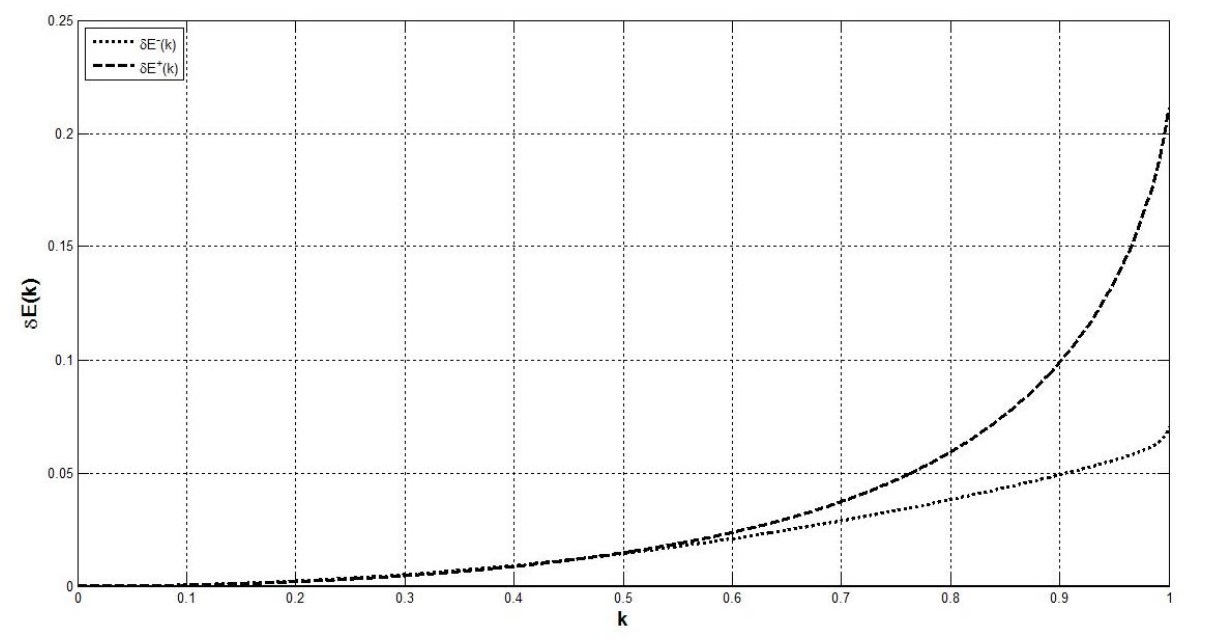 Графики функций (11) в зависимости от модуля k полного эллиптического интеграла приведены на рис. 2. Из этого рисунка видно, что dE- (k ) < 0,05 при k Î[0, 0, 9] , а dE+ (k ) < 0,05 при k Î[0, 0, 76] , следовательно, при k Î[0, 0, 76] функции (4) и (5) можно применять при решении прикладных задач для оценки полного эллиптического интеграла второго рода с инженерной точностью.