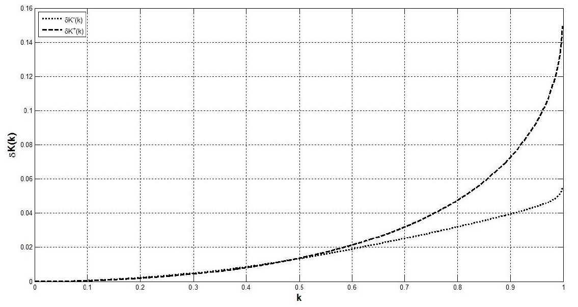 Графики зависимостей функций (16) от модуля k полного эллиптического интеграла приведены на рис. 4. По нему можно заметить, что dK- (k) < 0,05 при k Î[0, 0, 99] , а dK+ (k) < 0,05 при k Î[0, 0, 81] , значит, при k Î[0, 0, 81] функции (13) и (14) можно применять при решении прикладных задач для оценки полного эллиптического интеграла первого рода с инженерной точностью.