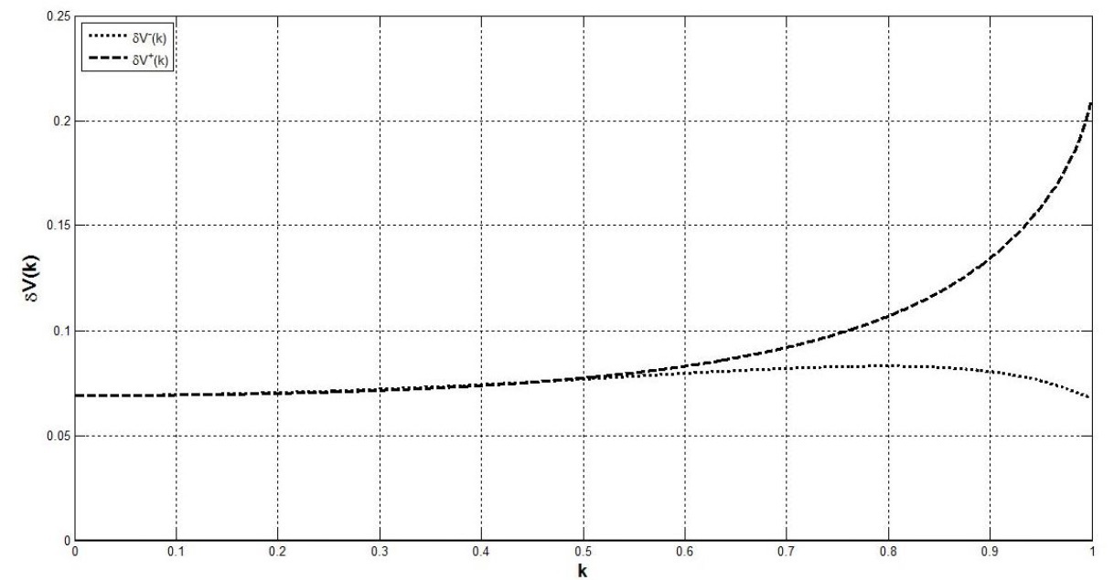 Из этого графика видно, что dV ± (k) > 0,05 при всех k Î (0,1) , при этом кривая dV + (k ) уходит вверх до заметных значений. Однако кривая dV - (k ) остаётся ограниченной и снизу, и сверху: 0,068 < dV - (k ) < 0,084 , следовательно, формула (19) вполне пригодна для определения по заданному k значения объёма (17) с инженерной точностью.