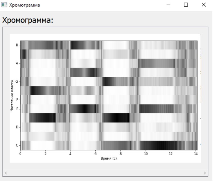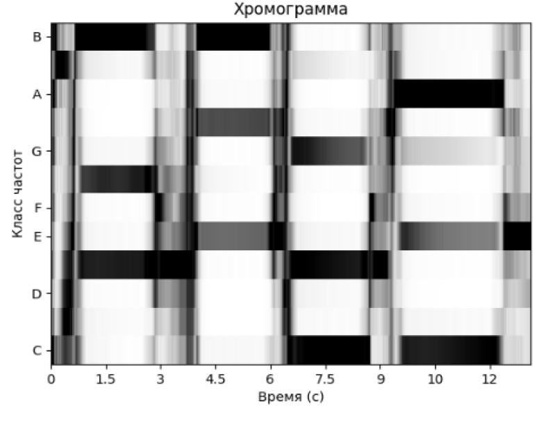 Как и спектрограмма, хромограмма представляет собой двумерную структуру, однако вместо частотного спектра в ней содержится информация об интенсивности 12 классов частот. Каждый класс соответствуют 12 нотам хроматической гаммы: С, С#, D, D#, E, F, F#, G, G#, A, A#, B. При этом не игнорируется номер октавы. Например, частоты нот С1 и C4 соответствуют одному и тому же классу, и их интенсивности усредняются (см. рис. 5).
