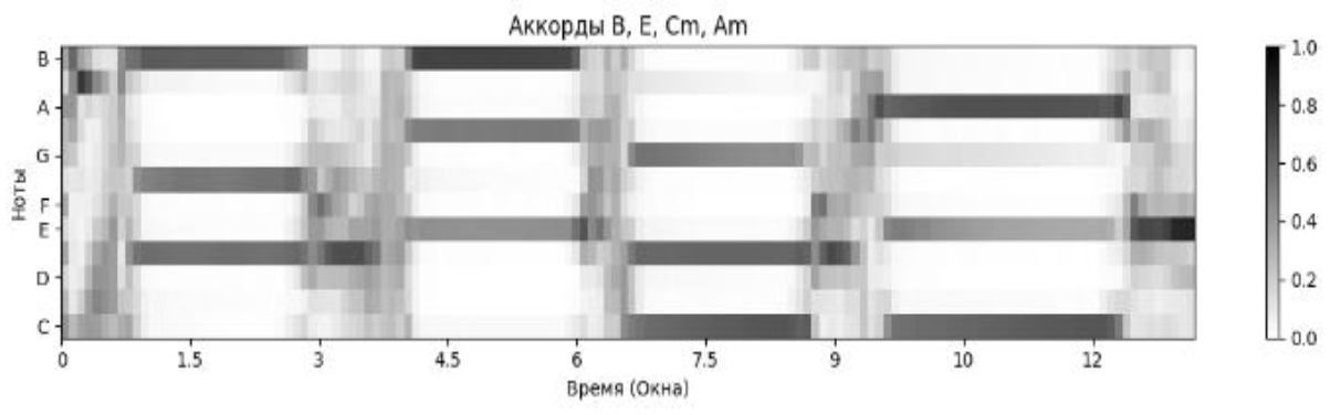 Благодаря пакету Librosa нет необходимости вручную прописывать коррекцию настройки инструмента и отображать интенсивности частот в интенсивности частотных классов. Поэтому далее можно найти сходство интенсивности нот в каждый промежуток времени с шаблонами аккордов. При этом получится последовательность аккордов (см. рис. 8).