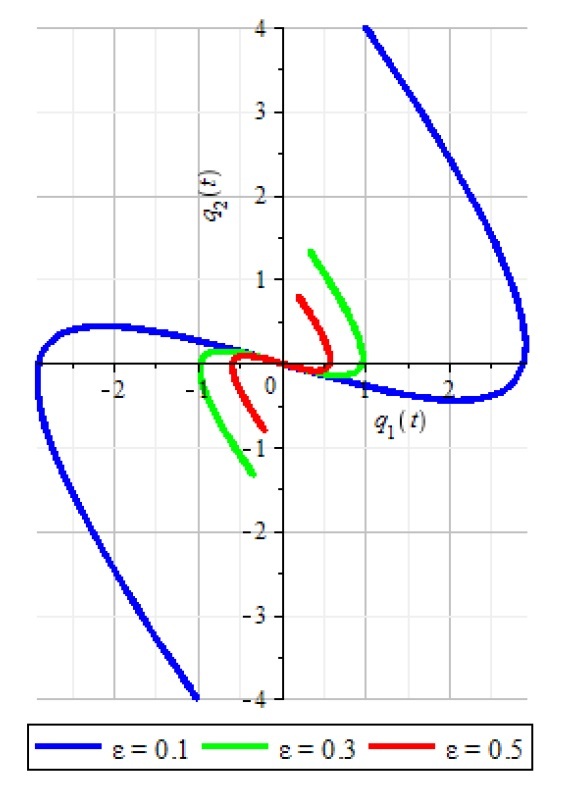 Рис. 2. График фазовой траектории системы (3) в конфигурационном пространстве 𝑂𝑞1𝑞2 при различных 𝜀 в случае 1).