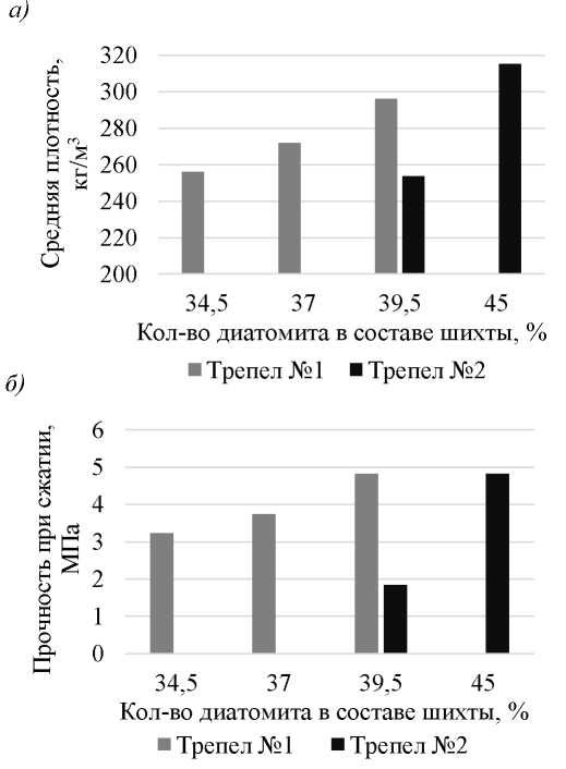 Рис. 1. Средняя плотность (а) и прочность при сжатии (б) образцов пористых стеклокерамических материалов.