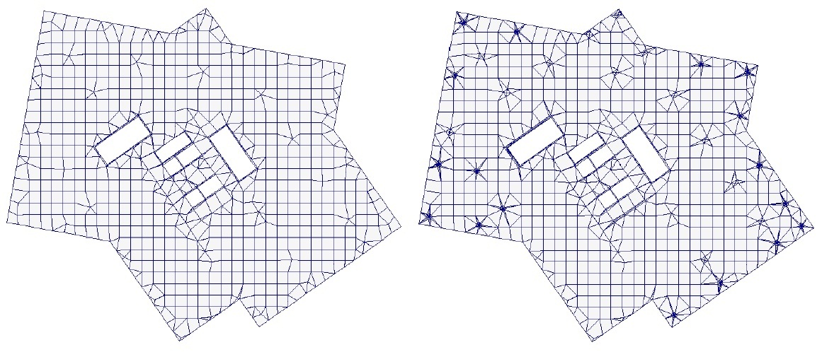 Рис. 1. Сетка конечных элементов плиты перекрытия 11-го этажа: слева – без учета АЖТ, справа – с учетом АЖТ.