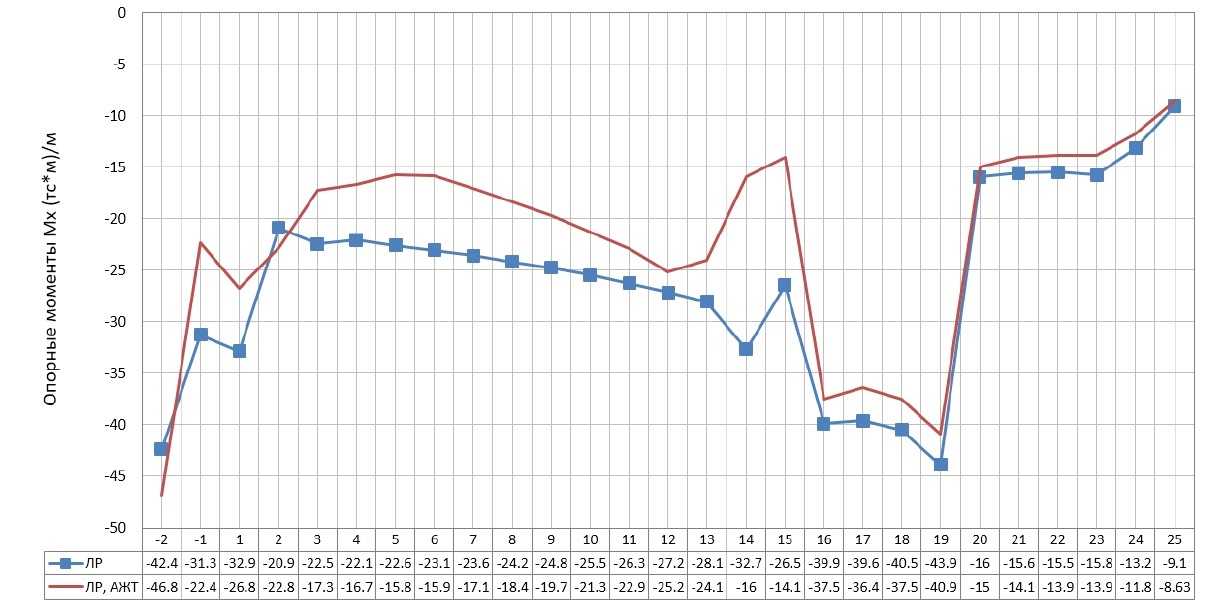 Влияние введения абсолютно жестких тел на изменение значений изгибающих моментов в плитах перекрытий всех этажей (-2 – 25) удобнее всего представить в виде графиков (рис. 2 – 5). На рисунках 2 и 3 представлено сравнение экстремумов опорных моментов Mx и My, а на рисунках 4 и 5 – пролетных моментов в плитах при линейном расчете (ЛР) без учета и с учетом абсолютно жестких тел (ЛР, АЖТ) от основного сочетания загружений (постоянное + длительное + кратковременное + ветер 1).