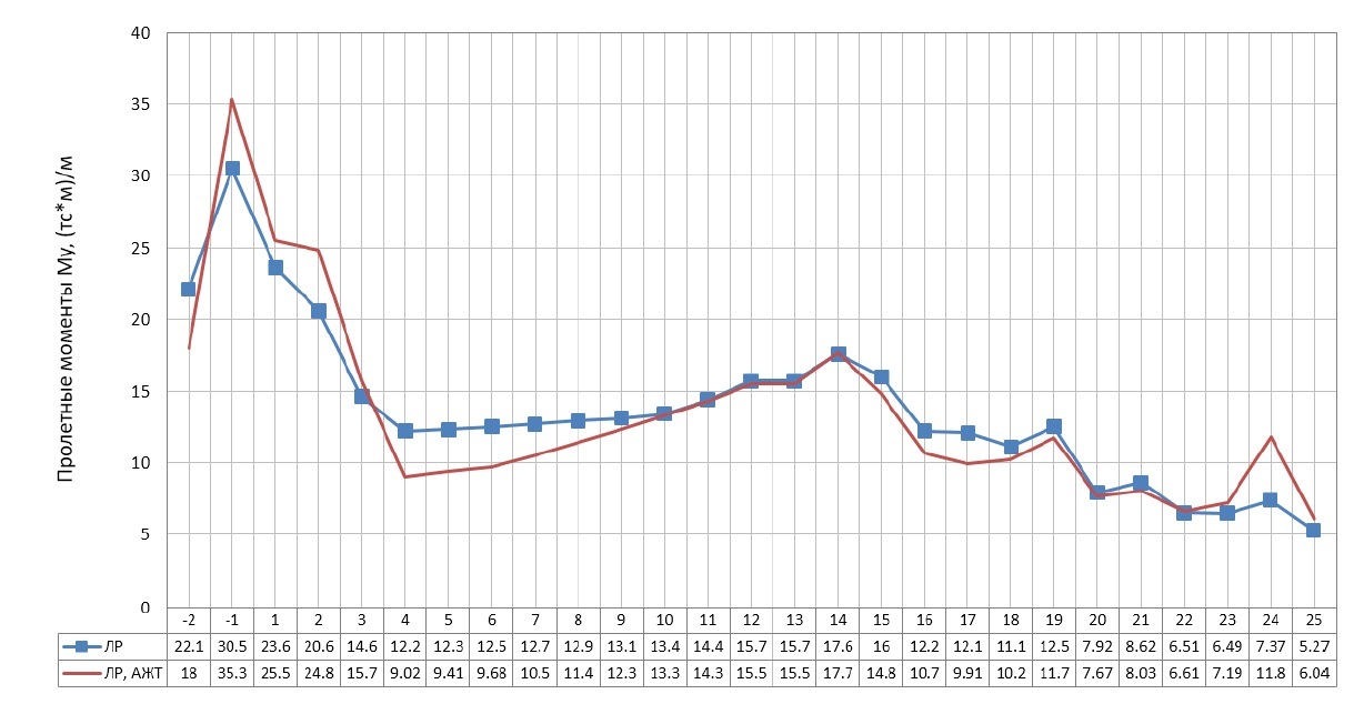 Анализ полученных результатов в большей степени подтвердил теоретические предположения об уменьшении изгибающих моментов в пролетах плит перекрытий и сглаживании пиков опорных моментов при введении АЖТ. Сравнение экстремумов изгибающих моментов показало, что снижение Мх в опорной зоне значительное и в некоторых случаях достигает 50 %, а в пролетах – 28 %.