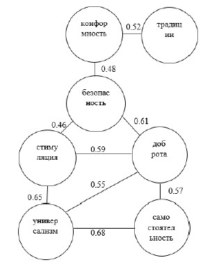 В данной корреляционной плеяде центром структуры выступает ценность «доброта», которая связана с ценностями «самостоятельность» (0,57), «стимуляция» (0,59) и «универсализм» (0,55). В свою очередь ценность «универсализм» также имеет связь с ценностями «стимуляция» (0,65) и «самостоятельность» (0,68). Стоит обратить внимание, что обнаруженное нами ядро объединяет между собой два полюса: «открытость изменениям» и «самотрансцендентность». Получившаяся структура может являться свидетельством того, что для людей со средним и специальным образованием любые попытки «выйти за свои границы», не является привычным действием и возможно только при достаточной гибкости личности. При этом важно отметить, что ценности «стимуляция» и «самостоятельность» не связаны между собой, а потому каждая из этих ценностей, и самоконтроль, и потребность разнообразия, является отдельным стимулом развития личности человека.