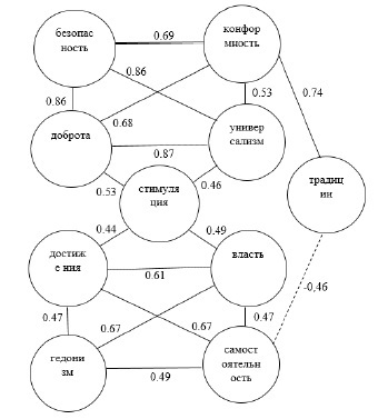 Нами также была выстроена структура ценностей, обнаруженных нами у респондентов с высшим образованием. Выделенную нами корреляционную плеяду (структуру) составляют десять ценностей, которые образуют два ядра (рисунок 2). Первое ядро объединяет ценности «власть», «достижения», «гедонизм» и «самостоятельность». Данные ценности, согласно Ш. Шварцу, представляют полюса «самовозвышение», «гедонизм» и «открытость изменениям». Образовавшееся ядро может являться свидетельством того, что для данной группы достижение определенного статуса и влияния в обществе, возможно только при помощи гибкости мышления и самостоятельных действий. Данная структура может быть следствием логического мышления, полученного в ходе научной деятельности. При этом важно отметить, что второе ядро объединяет ценности «безопасность», «конформность», «доброта» и «универсализм», которые имеют между собой сильные корреляционные связи и объединяют два полюсов «самотрансцендентность» и «консерватизм». Такого рода структура, включающая гуманистические ценности, способствуют к духовному росту человека, а «выход за рамки» может свидетельствовать о проявлении заботы, желании стабильности и благополучии для общества у респондентов с высшим образованием.