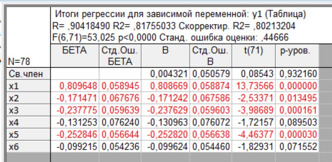- проведем проверку статистической значимости построенной регрессии по F- критерию. Fрасч = 53,02. Для анализа уравнения будем пользоваться величиной Fрасч, обратной, чем представлена на рис. Она составит 1:53,02 = 0,018. Обратимся к таблице значений F-критерия для уровней значимости α=0,05 и числа степеней свободы f. Критическая величина Fкрит равна 2,23, так как для числителя степень свободы f1 = k, т.е. составит 6 (число воздействующих факторов равно 6), а для знаменателя f2 = n − k− 1 = 78 − 7 − 1= 70. Для рассмотренной вероятности выполняется соотношение Fрасч < Fкрит, поэтому можно говорить о высокой степени адекватности анализируемого уравнения.