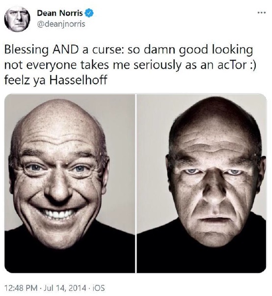 Основой для одного из мемов подобного формата послужили материалы профессиональной фотосессии американского актера Дина Норриса, известного по роли агента управления по борьбе с наркотиками Хэнка Шрейдера из сериала «Во все тяжкие». Мем представляет собой две фотографии актера, на которых он запечатлен веселым и хмурым, опубликованные с подписью «Благословение и проклятие: так хорошо смотрюсь, поэтому не все воспринимают меня всерьёз за актёра :) Понимаю тебя, Хассельхоф» (рис. 1). Коллаж из двух изображений в сеть выложил сам актер 14 июля 2014 года.