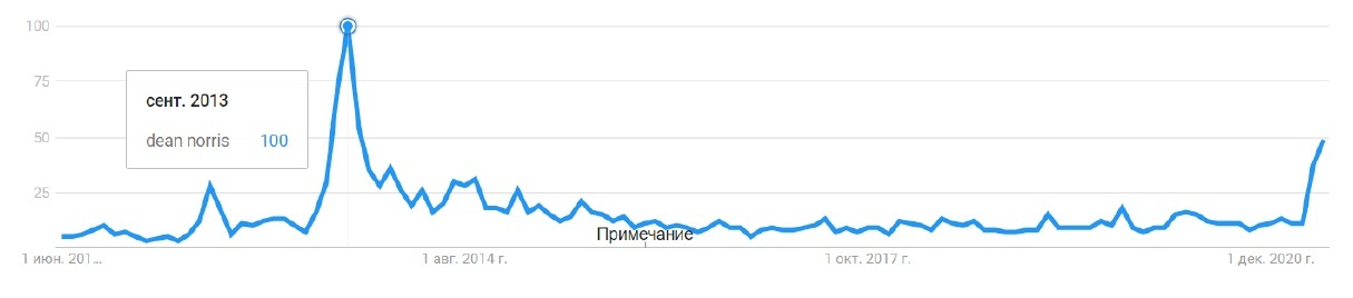 Первый мем с актером появился в 2017 году в аккаунте Instagram, посвященном сериалу «Во все тяжкие», однако не стал популярным. В апреле 2021 года он получил широкое распространение в том числе и за пределами фанатских групп. На рисунке 2 можно видеть график, показывающий динамику популярности поискового запроса «Dean Norris» за последние 10 лет. Пик популярности, приходящийся на сентябрь 2013 года, соответствует дате выхода 14 эпизода 5 сезона сериала, в котором героя, которого играет Дин, убивают.