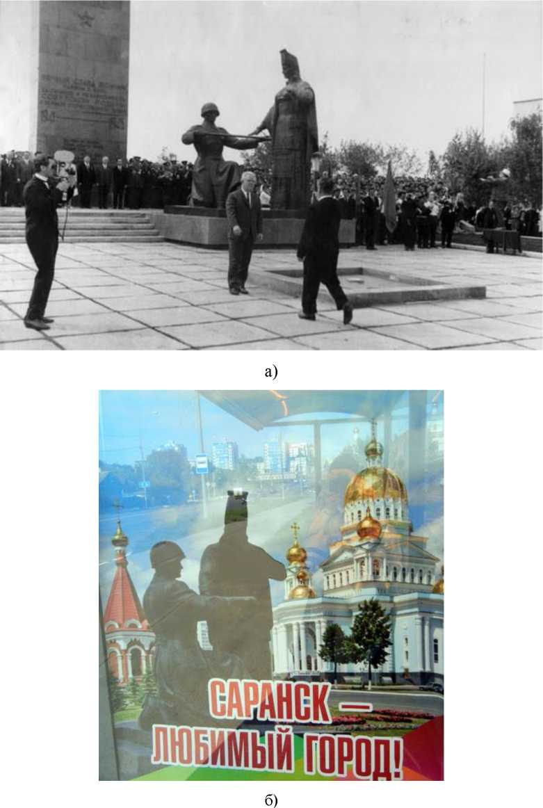 Рис. 2. Мемориал Вечной Славы в момент открытия в 1970 г. [12] – а); современная репрезентация в социальной рекламе на остановке городского транспорта – б).