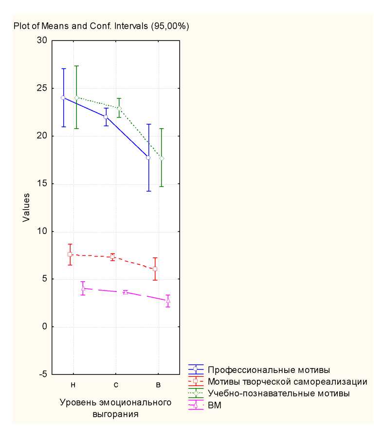 Профессиональные мотивы у студентов связаны в первую очередь с желанием получить профессию и в дальнейшем развиваться в ней, повышать квалификацию, делать все, чтобы стать высококвалифицированным специалистом. При высоком уровне эмоционального выгорания, влияние профессиональных мотивов снижается, появляется чувство собственной некомпетентности как специалиста. Высокий уровень эмоционального выгорания также ведет к снижению уровня мотивов творческой самореализации. Это проявляется в снижении активности, направленной на выявление, развитие и реализацию своих творческих способностей, снижается творческий подход к решению задач. Учебно-познавательные мотивы непосредственно связаны с самой учебной деятельностью, с содержанием и процессом учения. При высоком уровне эмоционального выгорания уровень данного мотива у студентов снижается, следовательно они начинают испытывать больше трудностей в процессе обучения, пропадает желание самостоятельного приобретения знаний. Исходя из полученных данных, мы также можем сказать, что высокий уровень выгорания ведет к снижению внутренней мотивации. Сама по себе активная познавательная деятельность перестает иметь высокую ценность и приносить удовольствие. Снижается внутреннее побуждение к приобретению новых знаний.
