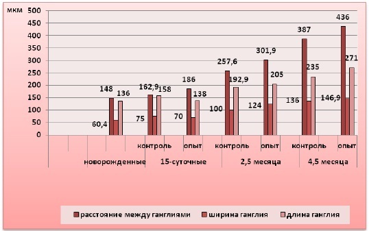 Рис 2. Динамика изменения размеров ганглиев рубца и расстояния между ними в постнатальном онтогенезе