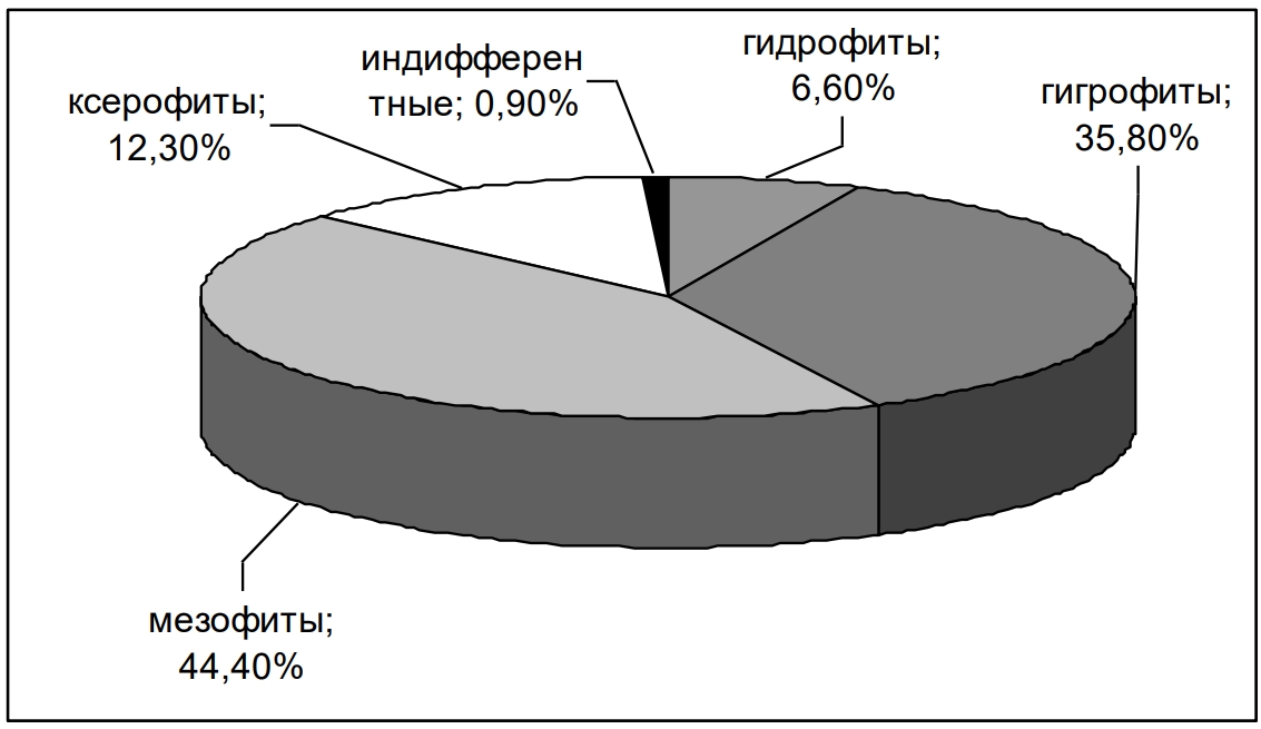Лидирующие позиции, как и в бриофлоре Удмуртии в целом [13], занимают мезофитные виды. Доля участия гигрофитных видов также велика, так как на территории заказника часто встречаются переувлажненные и заболоченные ценозы.