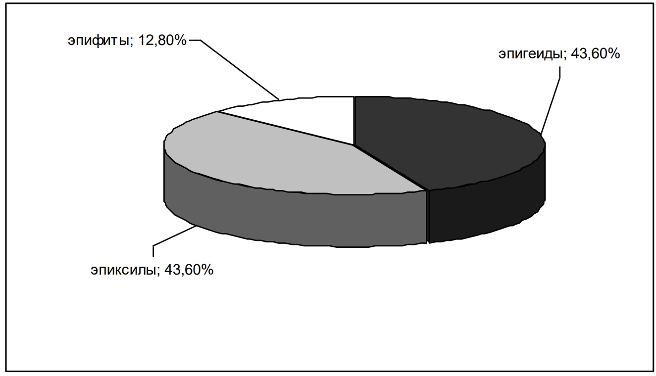 При анализе субстратного предпочтения бриофитов получены следующие данные. Выделено 3 субстратные группы: эпигеиды, эпиксилы, эпифиты (рисунок 2). Лидирующую позицию в исследованной бриофлоре делят группы эпигейных и эпиксильных бриофитов – по 46 видов (по 43,6% от общего числа видов). Эпигейные бриофиты образуют напочвенный покров в лесных фитоценозах, поселяются по берегам рек и ручьев на незадернованной почве и формируют пионерные сообщества в антропогенно нарушенных местах. Представителями эпигейной группы бриофитов являются крупные гигрофитные мхи из семейства гилокомиевых (Pleurozium schreberi (Brid.) Mitt., Hylocomium splendens (Hedw.) Bruch et al.), более мелкие растения из бриевых (Bryum pseudotriquetrum (Hedw.) P. Gaertn., B. Mey & Scherb.), мниевых (Plagiomnium cuspidatum (Hedw.) T.J. Kop., Mnium stellare Hedw.) и печеночники (Marchantia polymorpha L., Blasia pusilla L.). Эпиксильные бриофиты поселяются на валежнике, спилах деревьев (Orthotrichum obtusifolium Brid., Pylaisia polyantha (Hedw.) Bruch et al.). Особенностью бриофлоры Валамазского заказника является повышение роли эпиксильных бриофитов. В основном растительность заказника представлена мелколиственными лесными сообществами, которые сформировались на месте вырубок, либо образовались в результате зарастания полей. В лиственных лесах мохообразные практически не образуют напочвенный покров, предпочитая поселяться на гнилой древесине – субстрате с пониженной конкуренцией и медленным высвобождением питательных веществ. Именно поэтому группа эпиксильных бриофитов оказалась представлена так же многообразно, как и эпигейные мохообразные.