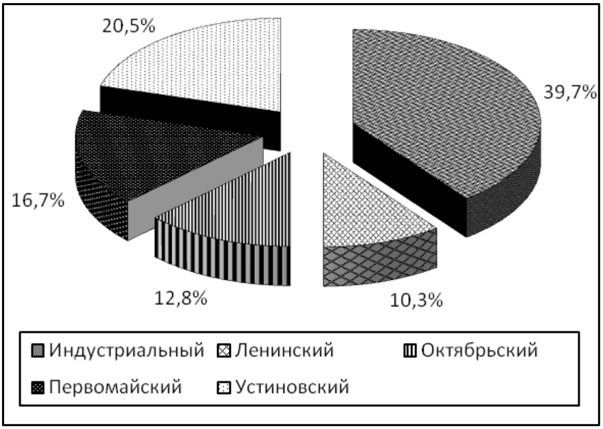 Рис. 1. Распределение количества мест произрастания S. Сanadensis по административным районам г. Ижевска.