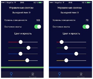 На рисунке 2 представлен фрагмент пользовательского интерфейса разработанного мобильного приложения. В данном случае подразумевается, что к 9-аналоговому выходу на Arduino подключена RGB светодиодная лента. Таким образом, перемещая ползунки, пользователь может изменить цвет и яркость освещения в помещении.