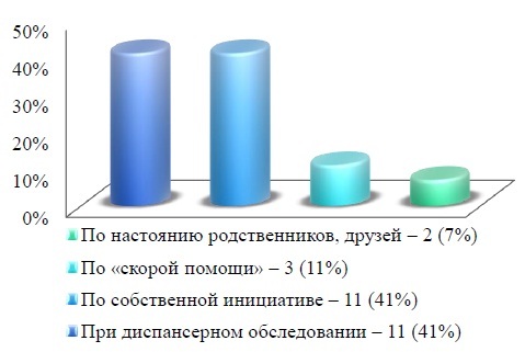 Выявлено, что практически половина опрошенных – 27 (43%) страдают ССЗ. Из них у 11 (41%) диагноз был установлен при диспансерном обследовании, 11 (41%) обратились к врачу по собственной инициативе, 3 (11%) – по «скорой помощи» и 2 (7%) по настоянию родственников или друзей (рис. 2).