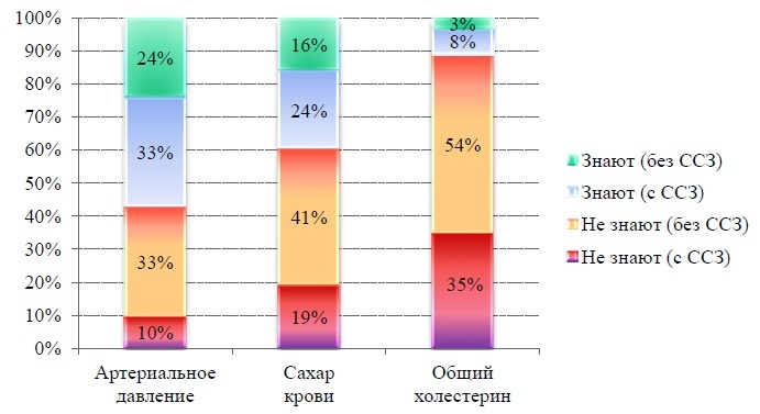 Исследование показало, что 38 (60%) респондентов не знают свой уровень сахара крови, среди которых 12 (44%) из числа, имеющих ССЗ, и 26 (72%) из числа, не имеющих ССЗ. Большинство (89%) опрошенных не знают уровень общего холестерина крови, из которых 22 (81%) из числа, страдающих ССЗ, и 34 (94%) из числа, не страдающих ССЗ (рис. 5).
