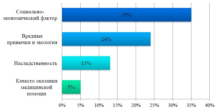 Среди факторов, оказывающих наибольшее влияние на продолжительность жизни, 35% опрошенных выделили социально-экономический фактор, по 24% – вредные привычки (курение, гиподинамия, переедание, злоупотребление алкоголем) и экологический фактор, 13% связывают с влиянием наследственности и 5% на первый план выносят качество оказания медицинской помощи (рис. 6).