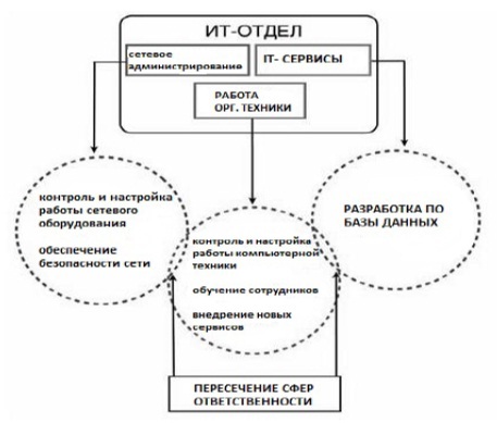 В современных условиях хозяйствования в большинстве компаний, значимость ИТ-отдела более весома, нежели роли просто затратного «эксплуатационного» подразделения и ИТ-подразделение в большинстве случаев ошибочно рассматривается как звено ответственное за развитие технологий автоматизации. Еще чаще (более чем в каждой 3-ей компании) ИТ-отдел воспринимается в качестве центра компетенции в области только лишь бизнес-процессов. Исходя из этого можно сделать вывод о возможности структурирования компаний на 2 группы: группа компаний, в которых ИТ-подразделение занято исключительно «классическими» задачами внедрения и эксплуатации ИТ-систем; и компании, ИТ-отделы которых более ориентированы на бизнес-процессы, преимущественное внимание в которых уделено развитию инноваций и совершенствованию бизнес-процессов за счет ИТ (их можно условно определить как «инновационные») [4]. Поскольку, чем больше внимания уделяется «инновационным» направлениям, тем менее возможны у ИТ-отделов проблемы эксплуатации. То есть в целях эффективной организации и эффективности деятельности неправильно рассматривать ИТ-отдел только лишь как исключительно техническую функцию, поскольку главным конкурентным преимуществом ИТ-отдела компании, осуществляющей свою деятельность в сфере интернет-технологий, является понимание бизнес-процессов компании, а не только знание чисто технических решений [2].