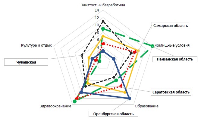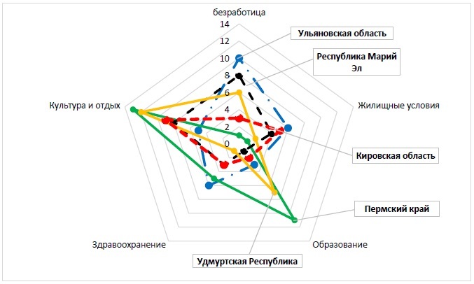 Особенностью анализа организации жизненного пространства является невозможность прямого сопоставления регионов по тем или иным статистическим показателям, что приводит к необходимости учета нескольких уровней обобщенных статистических показателей [9]. На основании выбранных критериев, информационную базу для определения которых составили данные официальной статистики по субъектам ПФО за 2014 год, была произведена оценка организации жизненного пространства регионов Приволжского федерального округа. В качестве инструмента обобщения информации выбран метод построения многоугольника (МНК) («радара») конкурентоспособности, представляющего собой графическое соединение оценок объектов по наиболее значимым факторам в виде векторов – осей [1]. В результате анализа достигается высокая степень наглядности имеющихся сильных и слабых сторон объекта и обеспечивается возможность сравнительной оценки ключевых преимуществ, создаются достаточные основания для совершенствования деятельности и усиления его позиций. Показатели оцениваются путем ранжирования по 14-балльной шкале (по числу регионов ПФО) [3].