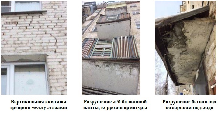 - В результате повреждения прежней кровли на отдельных участках стен имеются следы протечек. Произошло разрушение облицовочного слоя стен, цоколя, бетонных козырьков, балконной плиты (с оголившейся в нем арматуры), которые подверглась коррозии. Появились сквозные трещины по наружным стенам здания в количестве 2 шт. длиной до 110 см и шириной раскрытия до 1 см. Также на отдельных участках здания образовалась плесень.
