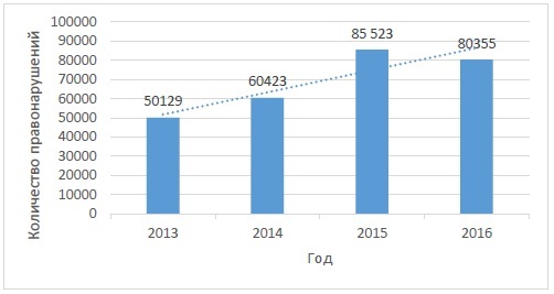 Рис. 2. Динамика количества административных правонарушений, возбужденных таможенными органами РФ в 2013-2016 гг.
