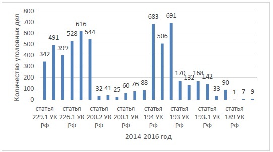 Из общего количества возбужденных таможенными органами в 2016 году уголовных дел 342 дела возбуждено по статье 229.1 УК РФ (контрабанда наркотических средств, психотропных веществ, их прекурсоров или аналогов, растений, содержащих наркотические средства, психотропные вещества или их прекурсоры) (в 2015 году – 399 дел; в 2014 году – 491 дела, 528 дел – по статье 226.1 УК РФ (контрабанда сильнодействующих, ядовитых, отравляющих, взрывчатых, радиоактивных веществ, огнестрельного оружия или его основных частей, взрывных устройств, боеприпасов, оружия массового поражения, средств его доставки, иного вооружения, иной военной техники) (в 2015 году – 544 дел; в 2014 году – 616 дел); 32 дела – по статье 200.2 УК РФ (контрабанда алкогольной продукции и (или) табачных изделий) (в 2015 году – 25 дел; в 2014 году – 41 дело); 60 дел – по статье 200.1 УК РФ (контрабанда наличных денежных средств и (или) денежных инструментов) (в 2015 году – 88 дел; 2014 году – 76 дел) , 1 дело по статье 189 УК РФ (незаконный экспорт из РФ или передача сырья, материалов, оборудования, технологий, научно-технической информации, незаконное выполнение работ (оказание услуг), которые могут быть использованы при создании оружия массового поражения, вооружения и военной техники) (в 2015 году – 7 дел; в 2014 году – 9 дел) [10; 11].