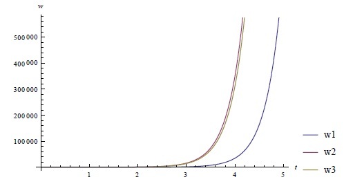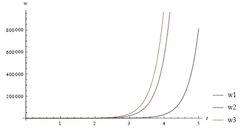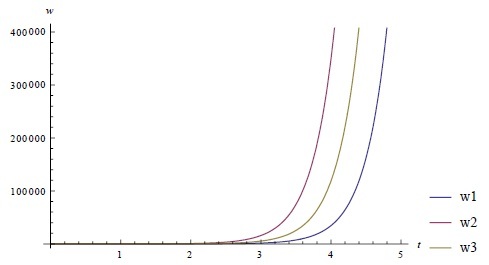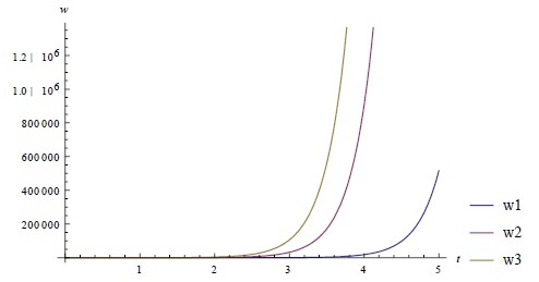 1. Пусть, в системе заданы высокие налоговые ставки 𝜏1 = 0.8, 𝜏2 = 0.9, доходы от которых формируют бюджет w3, который полностью перераспределяется в пользу Домохозяйств (𝜀 = 0), при этом весь доход попадает под обложение налогом со стороны Государства (𝛾 = 0). Тогда решение (3) исследуемой системы (2) при значениях 𝑎 = 1, 𝑏 = 0.68, 𝛼 = 0.001, 𝛽 = 0.1, 𝑝 = 5, 𝐿 = 900, 𝜀 = 0, ∆𝐾 = 1, 𝐶0 = 0, 𝐶1 = 0 будет иметь вид, изображенный на рис. 1.