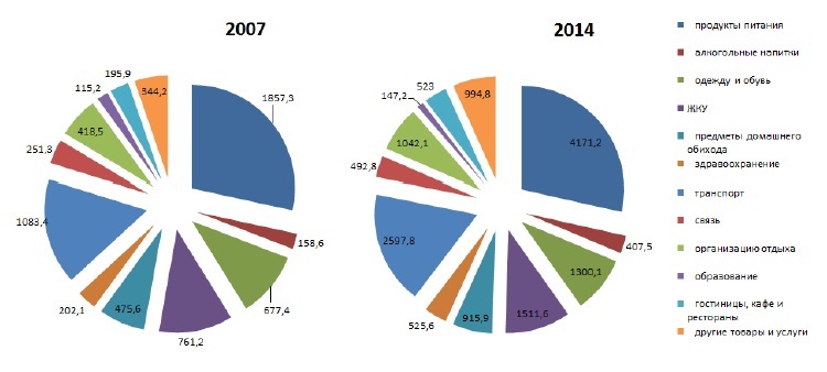 В период с 2007 по 2014 гг. структура расходов населения принципиально не изменилась (рис. 1). Произошел рост расходов, к примеру, расходы на услуги здравоохранение выросли в 2,6 раза, как и расходы на покупку алкоголя, на жилищно- коммунальные услуги расходы увеличились в два раза, также в два раза увеличились расходы на транспортные услуги, услуги связи, расходы на покупку одежды и обуви, расходы на отдых.