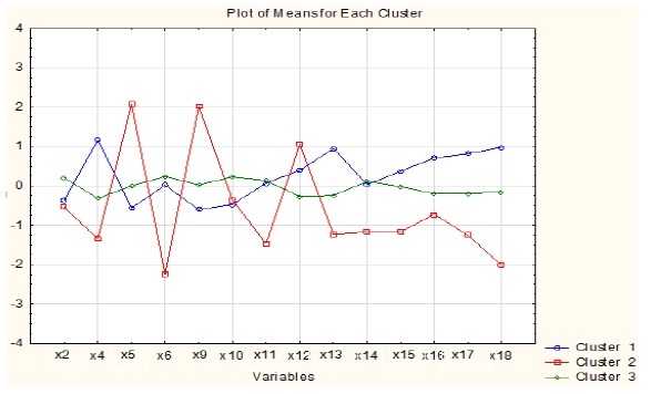 В данном случае, основываясь на графике изменений расстояний при объединении кластеров, можно остановиться на варианте разбиения на 3 кластера (рис. 2). На рисунке 2 представлены средние значения переменных для каждого кластера.