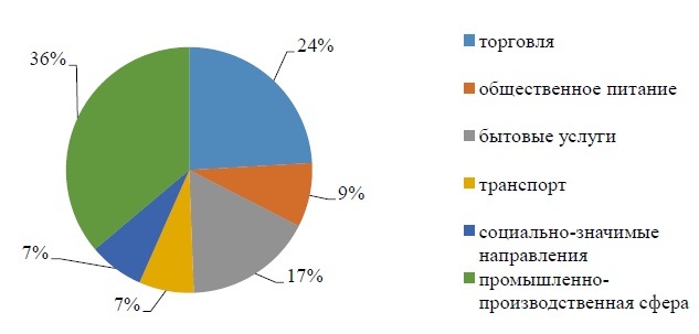 В 2015 г. получателями поддержки стал достаточно широкий круг предпринимателей, осуществляющих работу в различных сферах деятельности (рис. 2). По данным диаграммы можно сделать вывод о том, что большую часть занимает предпринимательство в промышленно-производственной сфере. Проекты реализуются и получают государственную поддержку для развития. Сфера малого предпринимательства в немаловажной степени способствует организации конкурентной среды, формированию рыночного равновесия. Развитие малого предпринимательства в Бурятии является важным фактором, обеспечивающим экономический рост и занятость населения, насыщение рынка товарами и услугами.