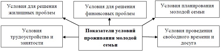 Условия проживания составляют ту среду, обстановку, в которой молодая семья возникает, существует и развивается. Адаптация молодой семьи не может произойти вне процессов социальной, экономической и политической ситуации в стране. Государство призвано создавать молодой семье условия для достижения уровня социального благосостояния, закрепленного в Конституции РФ, необходимого для самостоятельного существования семьи и реализации ее основных функций.