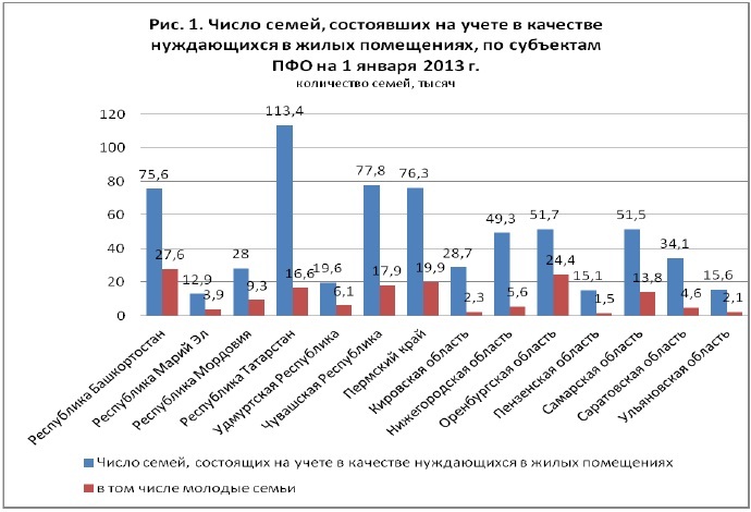 По данным Федеральной службы государственной статистики общее число семей, состоящих на учете в качестве нуждающихся в жилье по Российской Федерации на 1 января 2013 г. составило 2 748 252 единиц. Из них 649 856 семьи Приволжского федерального округа (23,6%) (далее – ПФО), в том числе 156 168 молодых семей (24% от семей ПФО). Данные по субъектам ПФО приведены на рисунке 1.