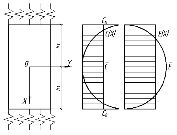 Рис. 1. К расчету ползучести методом усреднения в зависимости от концентрации по высоте сечения: