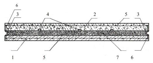 Рис. 1. Трехслойная стеновая панель в разрезе: 1 – наружный бетонный слой; 2 – внутренний бетонный слой; 3 – каркас; 4 – перемычки;5 – армирующие сетки; 6 – анкерные крепления; 7 – вакуумированная теплоизоляционная панель.
