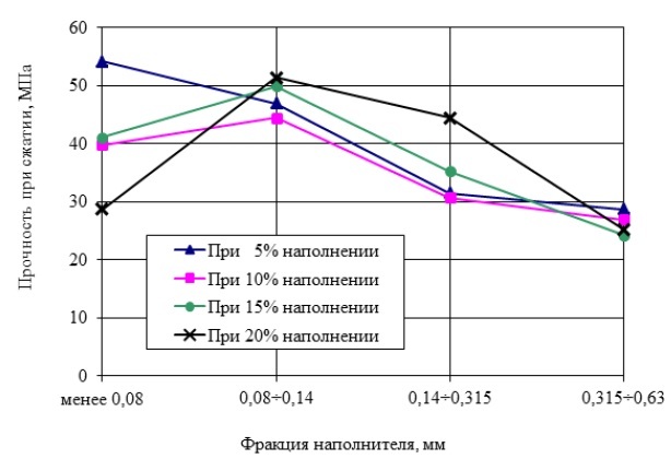 Рис. 1. Изменение прочности наполненных цеолитсодержащей породой Атяшевского месторождения Республики Мордовия цементных композиций в зависимости от дисперсности наполнителя.