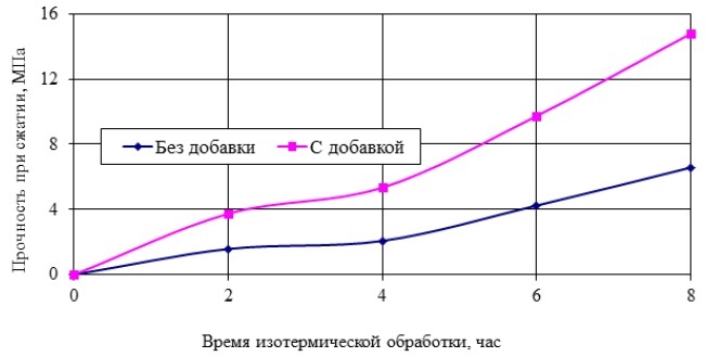 Влияние разработанной добавки на процессы, происходящие в композициях при твердении, аналогично действию кристаллизационной затравки в цементных системах. Составляющее такой добавки способны в цементных вяжущих при затворении водой образовывать соединения в виде микро- или субмикрокристаллов, которые служат центрами кристаллизации. В результате выкристаллизация гидратных новообразований из перенасыщенных растворов ускоряется, что, в итоге, и приводит к росту прочности цементного камня. Особенно явно это проявляется при тепловлажностной обработке композиций. На рисунке 2 представлены графики зависимости набора прочности цементных композитов от времени их изотермического выдерживания с добавкой и без неё. Наполнение композиций кристаллизационной затравкой составляло 5% от массы цементного вяжущего. Температура тепловлажностной обработки составляла +45С (±5С).