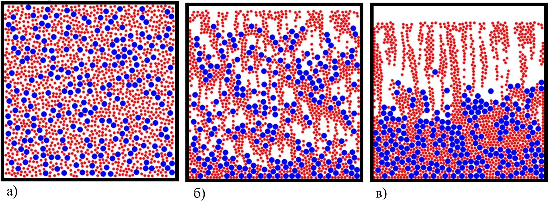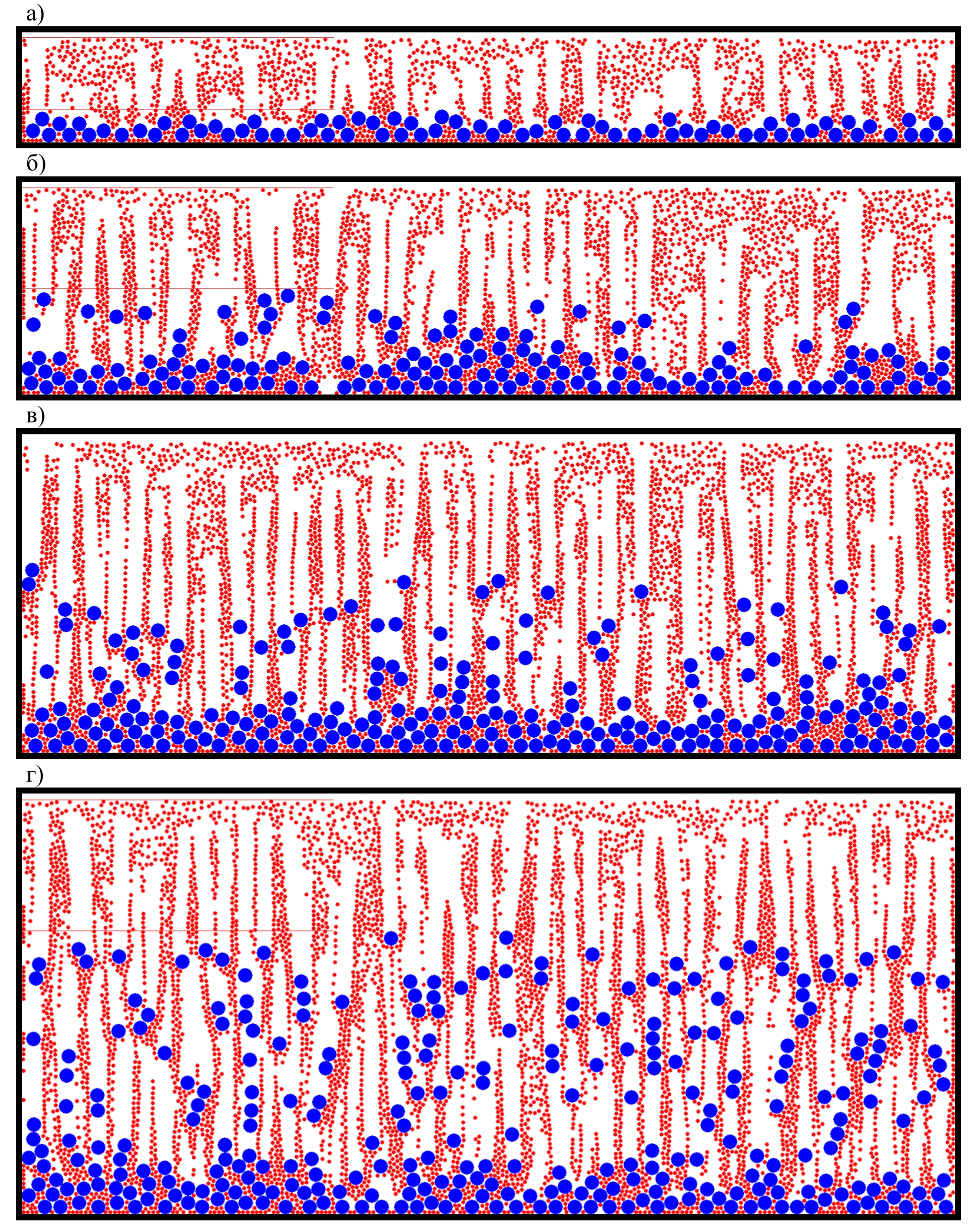 Рис. 3. Результаты моделирования распределения частиц наполнителей по высоте поперечного сечения отвержденных полимерных композитов (размеры частиц наполнителя – 𝑟₁ = 0.1 мм, 𝑟₂ = 0.05 мм).