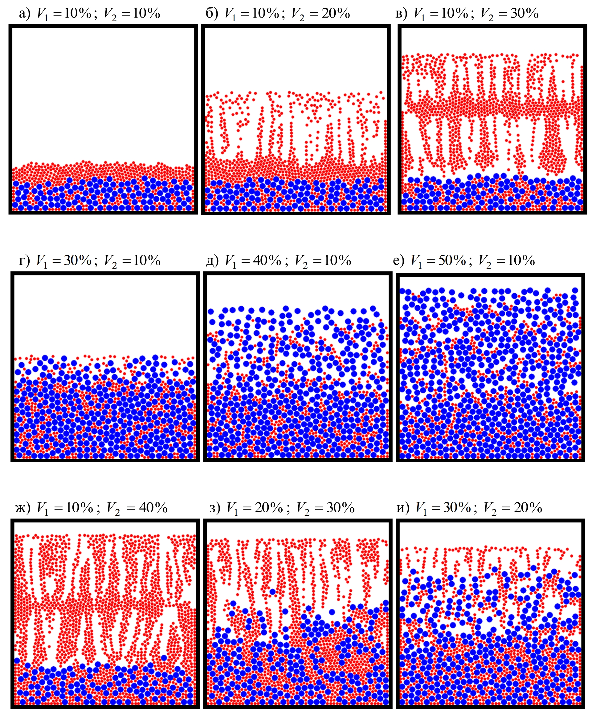 Проведенный анализ результатов моделирования показал, что при увеличении доли мелкого наполнителя (𝑟₂ = 0.05 мм) с 10 до 40% при фиксированном (10%) содержании крупного наполнителя (𝑟₁ = 0.1 мм) наблюдается (рис. 3, а – в) увеличение толщины переходного слоя. Толщина слоя осадка, содержащего как крупные, так и мелкие частицы наполнителя, для этих составов практически не меняется. Повышение в составе наполнителей крупных частиц (𝑟₁ = 0.1 мм) с 10 до 30% при постоянном содержании мелких частиц (𝑟₂ = 0.05 мм; 𝑉2 = 10%) приводит к значительному увеличению максимально-наполненного слоя осадка (рис. 3, а, г) с последующим снижением его толщины в интервале от 30 до 50% (рис. 3, г – е). Толщина слоя, содержащего частицы наполнителя во взвешенном состоянии, для этих же соотношений наполнителей существенно возрастает. Изменение соотношения крупного и мелкого наполнителей, особенно для высоконаполненных систем (например, при 𝑉₁ + 𝑉2 = 50%), позволяет значительно варьировать распределение частиц наполнителей, а, следовательно, и свойств по высоте поперечного сечения (рис. 3, д, ж – и). Проведенное моделирование показало, что процесс пофракционной сепарации наблюдается как в высоконаполненных, так и в малонаполненных композитах.