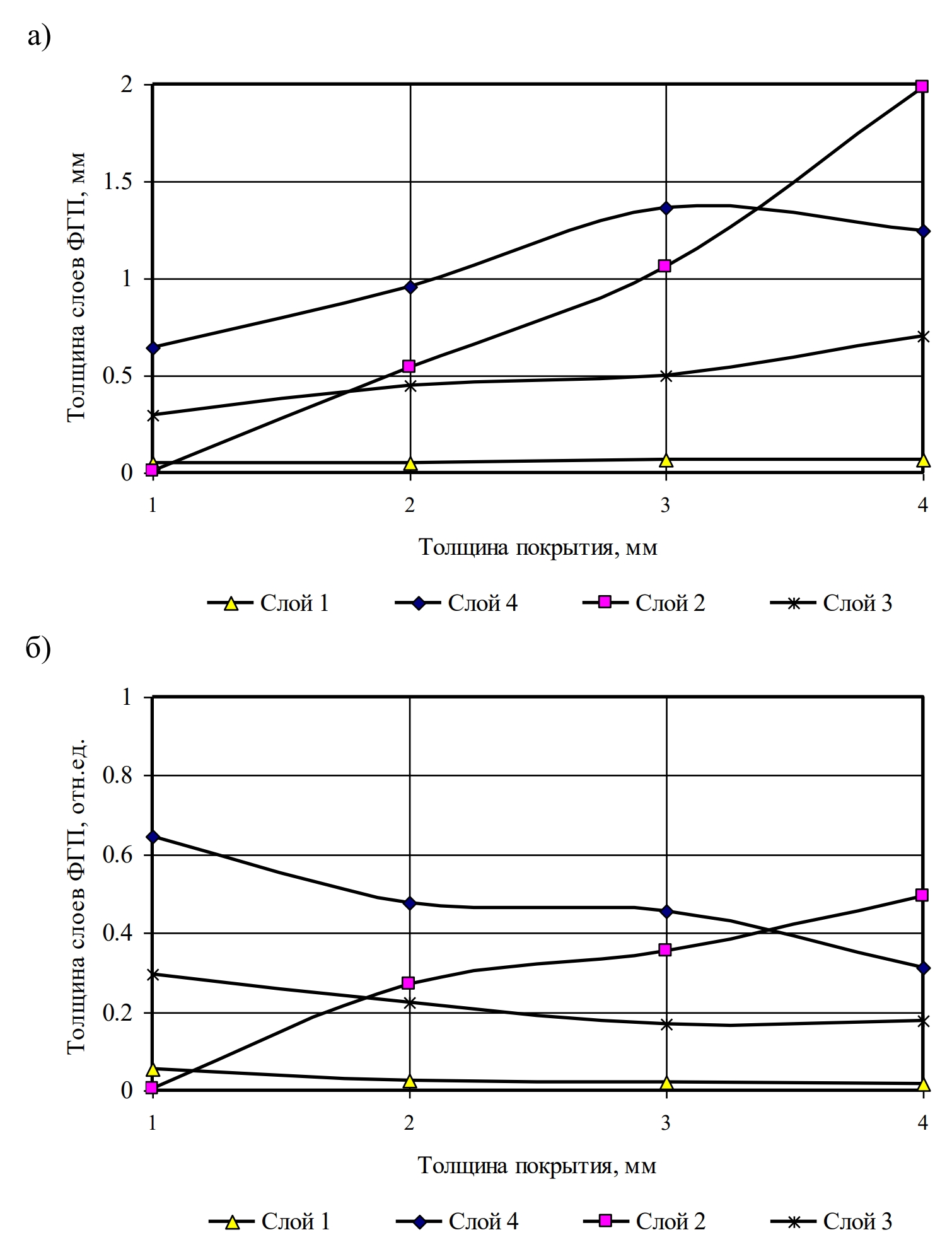 Рис. 5. Изменение высоты слоев в эпоксидных композитах в зависимости от толщины покрытия в абсолютных (а) и относительных (б) величинах: слой 1 – ненаполненное связующее; слой 2 – слой со взвешенным расположением наполнителя обоих видов; слой 3 – слой осадка; слой 4 – монодисперсный слой, содержащий только мелкий наполнитель.