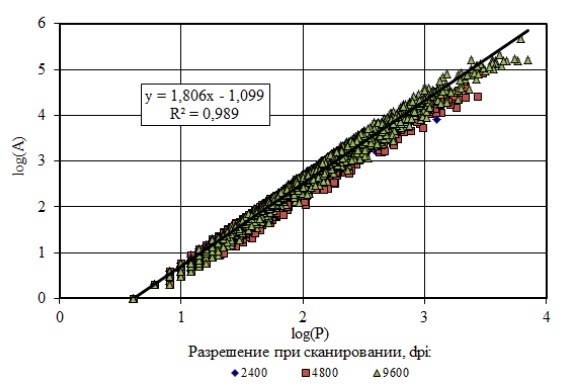 Из анализа полученных данных видно (рис. 1), что связь между периметром и площадью пор, полученных при сканировании исследуемых поверхностей с различным разрешением (2400, 4800 и 9600 dpi) описывается линейной зависимостью с коэффициентом детерминации 𝑅2 = 0.989. Полученные результаты подтверждают перспективность использования предлагаемого подхода для определения фрактальной размерности поровой структуры, в том числе дисперсно-наполненных мелкозернистых бетонов [14].
