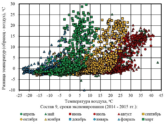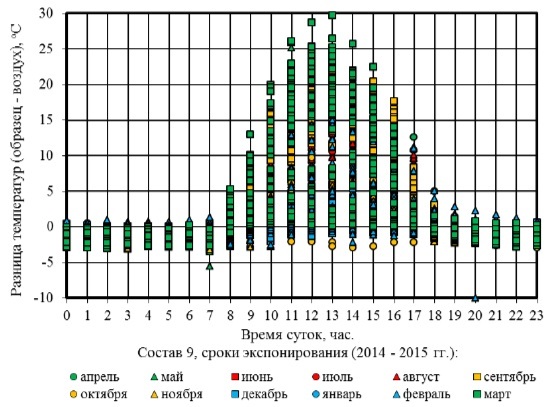 В работах [12; 13] показано, что в процессе натурного экспонирования бетонных образцов происходит разогрев поверхности, зависящий от температуры окружающего воздуха и интенсивности солнечного излучения. Для месяцев с низкой среднесуточной температурой (менее 5 оС) разность между температурами воздуха и поверхности образца минимальна. По мере повышения температуры воздуха разброс показателей возрастает (рис. 1); в летние месяцы данный параметр может достигать 20÷30 оС; наибольший разогрев поверхности образцов, как правило, происходит с 10:00 до 16:00, т.е. в момент наибольшего воздействия солнечной радиации (рис. 2).