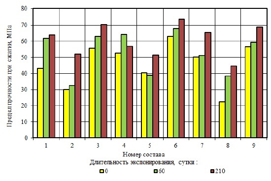 Для контрольных составов, а также через 60 и 210 суток экспонирования бетонных образцов на натурной площадке фиксировались следующие упруго-прочностные показатели: плотность, предел прочности при сжатии и растяжение при изгибе, модуль упругости и максимальная деформативность при сжатии. Экспериментально установлено, что в процессе экспонирования в течение 210 суток наблюдалось, в целом, повышение предела прочности при сжатии (рис. 3), связанное, прежде всего, с продолжением процессов гидратации. Наибольший прирост характеристики, достигающий, соответственно, 73 и 100% к 210 суткам, наблюдается для составов 2 и 8 с максимальным содержанием песка (75% от твердой фазы смеси). Для контрольных образцов этих же составов зафиксированы наименьшие прочностные показатели при сжатии – 30 и 22 МПа.