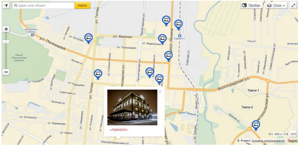 Одним из главных преимуществ нового портала является интерактивная туристская карта с указанием достопримечательностей, объектов туристской инфраструктуры, мест проведения досуга, отдыха в Мордовии и т. д., изображенная на рисунке 2. Это очень эффективный и информативный способ представления и передачи географической (имеющей пространственную привязку) информации. Пользователь в зависимости от предпочтений может наглядно увидеть расположение интересующих его объектов относительно собственного местонахождения и относительно друг друга, вычислить расстояние от себя до них. Интерактивная карта отвечает на запросы туристов практически немедленно, что позволяет пользователю ощущать себя более комфортно.
