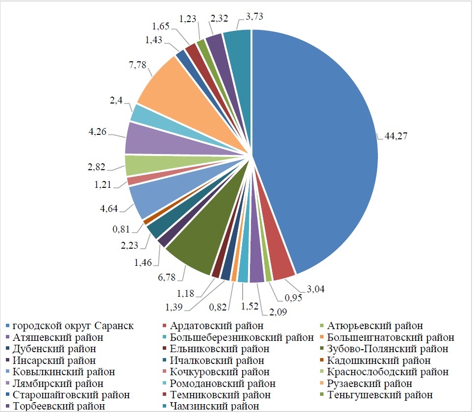 Рис. 1 Структура численности постоянного населения Республики Мордовия по муниципальным образованиям, %.